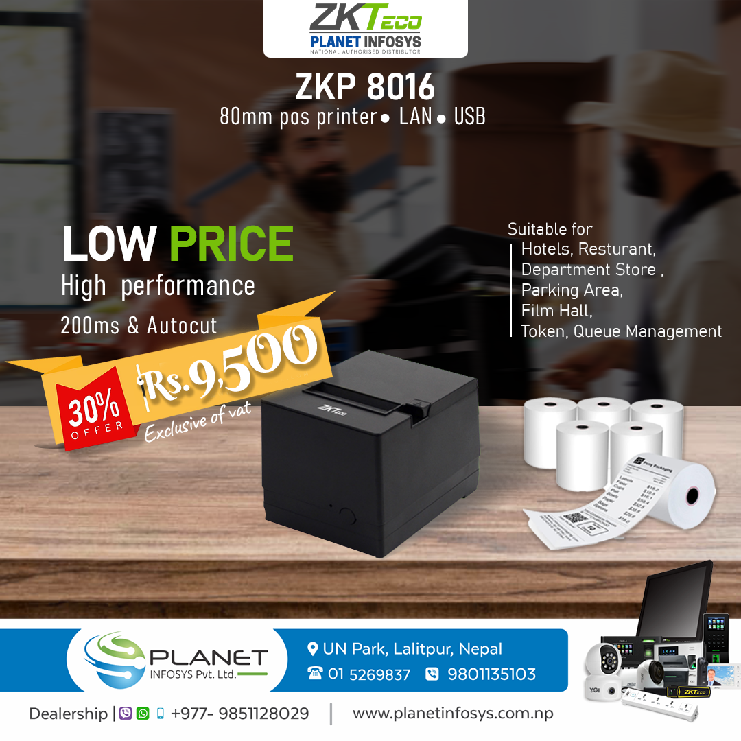 Planet Infosys Pvt.Ltd. is authorized distributor of ZKTECO products in Nepal, among various proudcts we are distributing Facial biometric time attendance devices and access control devices in Nepal. A part we have eattendance web based online time attendance software, free time management software for zkteco devices. Now we also distribute ZKTE...